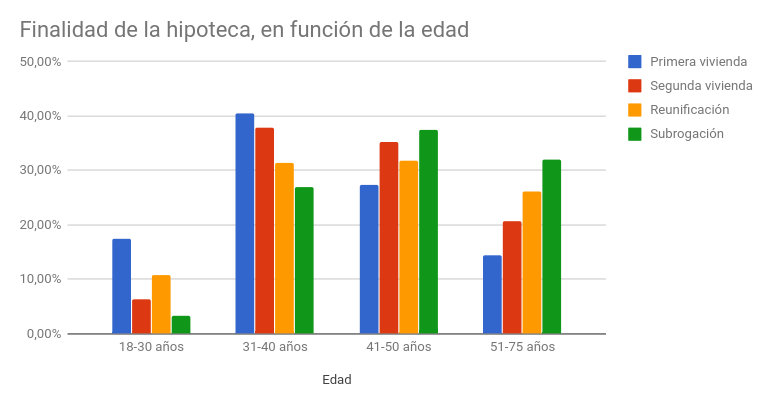 La finalidad para la que se pide una hipoteca varía con la edad. Así, los más jóvenes las solicitan más para adquirir la primera vivienda mientras que a medida que se cumplen años el objetivo por el que se pretende son otros: comprar una segunda residencia, reunificar deudas…