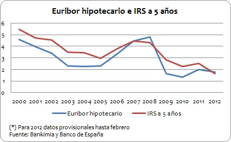 Observando la evolución histórica de ambos índices, es indudable que, en media, los valores del IRS a 5 años son superiores a los del Euribor a 12 meses. Si se toma como ejemplo el período 2000-2011, el valor promedio del IRS a 5 años fue del 3,6% frente al 2,9% del Euribor a 1 año.
