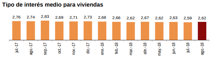 Siguiendo con otras cifras al respecto, el tipo de interés medio descendió hasta el 2,62 %, (lo que implica un descenso de 4,3 puntos porcentuales respecto los datos de hace un año) y el plazo medio de 24 años. En las hipotecas a tipo variable, el interés medio inicial fue del 2,43 % (un 5,5 % menor respecto agosto de 2017) y en las fijas fue del 2,99 % (un 3,1 % más bajo que un año antes).