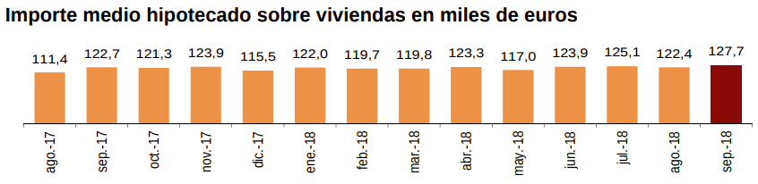 Como datos más generales, el plazo medio fue de 24 años y el tipo de interés medio fue del 2,59 %, lo que implica una bajada del 8,3 % respecto septiembre de 2017.