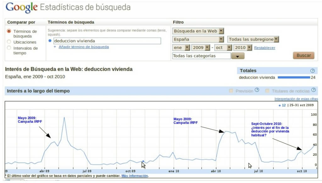 Intentaremos tomar el pulso a Internet en base a la evolución del volumen de búsquedas de determinados términos en Google. Concretamente, vamos a averiguar si las modificaciones aprobadas en relación a la deducción por vivienda habitual a partir de 2011 se reflejan en el buscador.
