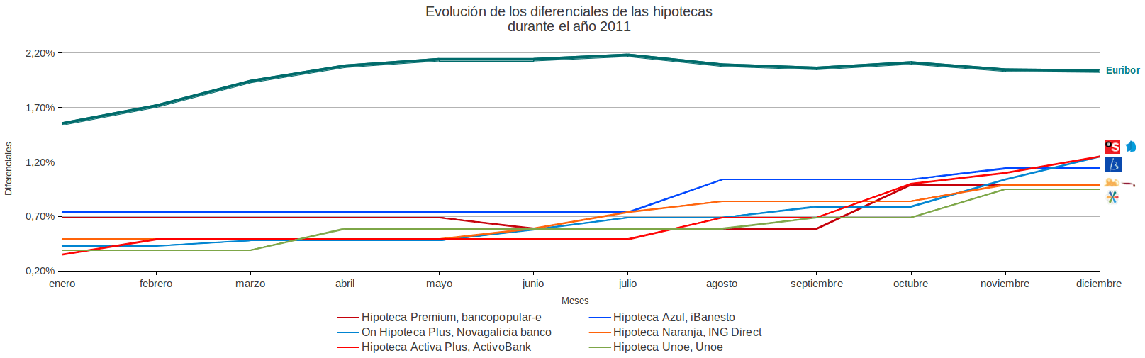 Para realizar la gráfica hemos cogido las hipotecas estrellas de algunas de las entidades que ofrecen sus hipotecas online y que tienen total transparencia a la hora de mostrar sus intereses. Hemos incluido también el euribor hipotecario para poder comparar la evolución de los diferenciales con la evolución del euribor.