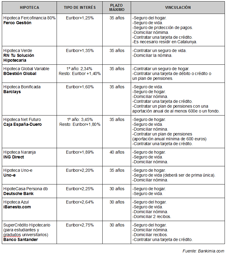 En esta tabla les detallamos las hipotecas que ofrecen los tipos de interés más atractivos del mercado para una vivienda valorada en 130.000 euros, con un importe concedido de 100.000 euros a un plazo de amortización de 30 años y a un cliente de 35 años. No obstante, la mayoría de estos préstamos llevan asociados, como mínimo, 3 productos a contratar: