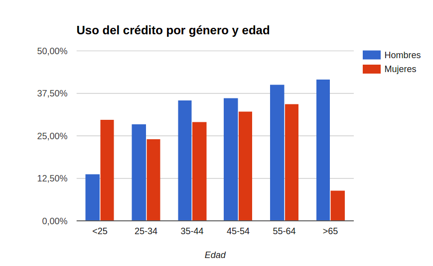 Así, los participantes más mayores (a partir de 55 años) son los que han asegurado usar más el crédito. Entre 55 y 64 años, los hombres lo afirmaron en un 44,62% y las mujeres, un 34,38%.