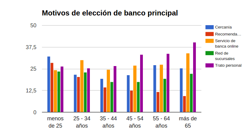 La cercanía de las sucursales, las recomendaciones de terceros y el trato personal. Son los tres motivos más argumentados por los menores de 25 años a la hora de seleccionar un banco. Las prioridades evolucionan a medida que se cumplen años… Hasta los 35 años. A partir de ahí son las mismas hasta pasados los 65.