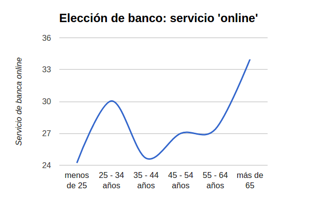 Otro aspecto a resaltar es la evolución de la importancia que se da al servicio de banca ‘online’ que, salvo una punta entre los 25 y los 34, va en aumento a medida que se cumplen años.