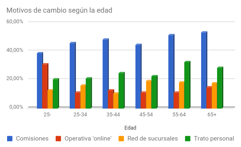 Siguiendo con los resultados, y a pesar de que también lo indican como motivo principal de cambio, los jóvenes dan menos importancia a las comisiones que los mayores. La explicación la podría estar en que la propia operativa a través de Internet, en la mayoría de las veces, no tiene ningún coste.